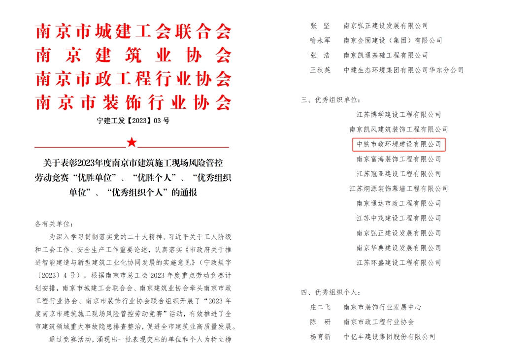 11月13日,2023年度南京市建筑施工現場風險管控勞動競賽表彰名單公示,南京龍袍項目代表公司獲得“優秀組織單位”表彰。...